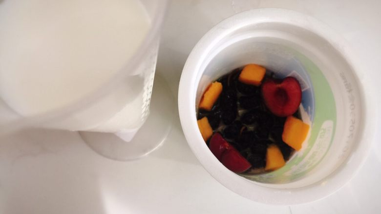 3. 倒入酸奶,要轻轻的少量的倒入,不然水果容易冲跑