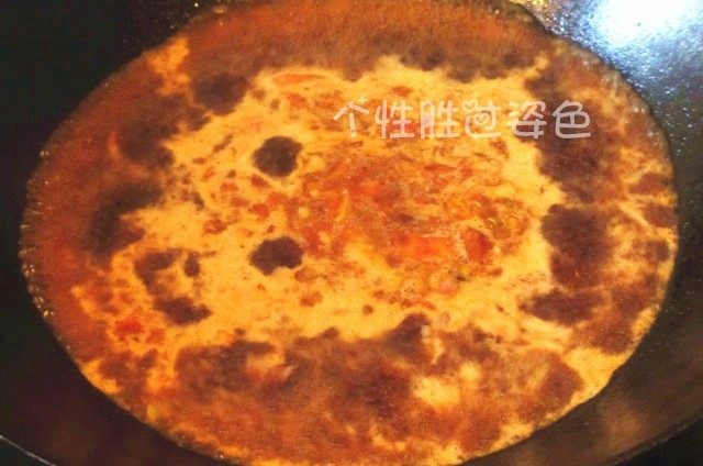 7. 加水,直至洋葱番茄煮成浓稠状,加盐、黑胡椒粉,在加入淀粉水,烧开浓稠状即可!