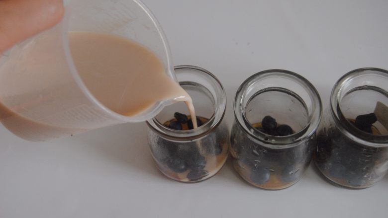 6. 20克细砂糖和50克清水小火慢煮至琥珀色,取出倒入准备好的小玻璃瓶底部