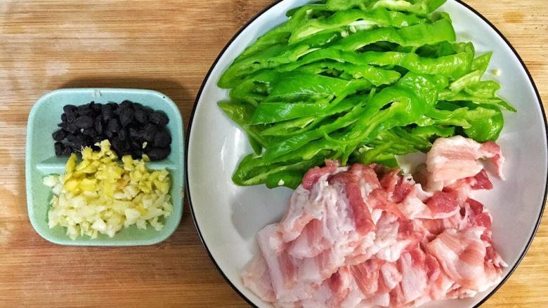9. 青椒豆豉五花肉备料 青椒去头去籽 切丝