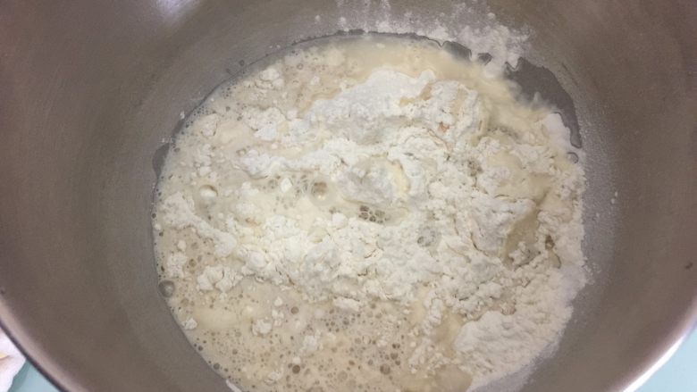 1. 厨师机的盆中加入中粉、盐、砂糖、用少量温水化开的酵母和105克左右的清水