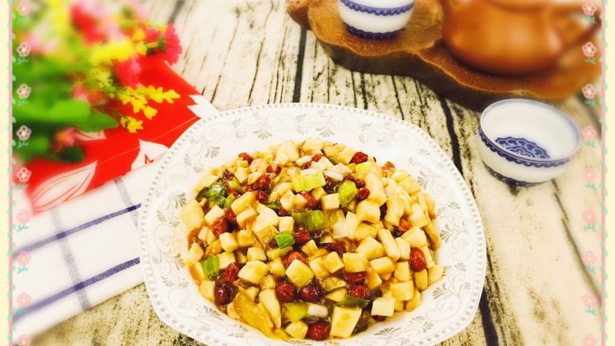 16. 倒入花生米,炒匀,出锅前淋少许香油,可以出锅喽!
