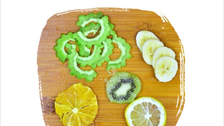 21. 苦瓜5克 香蕉4片 橙1片 猕猴桃1片 柠檬1片