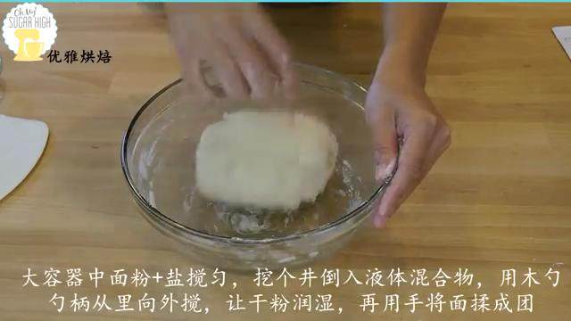 5. 大容器中加面粉、盐搅匀,倒入酵母水,搅拌,揉成面团