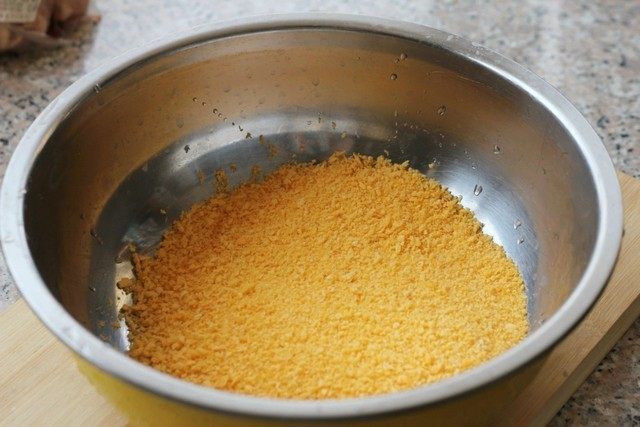 7. 沾满面包糠的鸡块放到不粘烤盘上