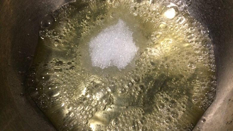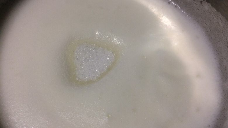 5. 打至有少量的小鱼眼泡加入第二次的细砂糖打发。