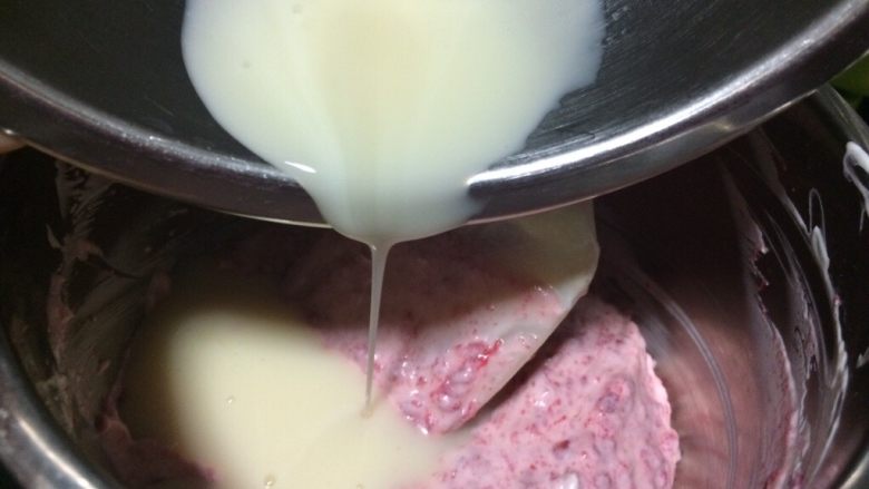 19. 再加入吉利丁液,混合均匀,成树莓慕斯液。