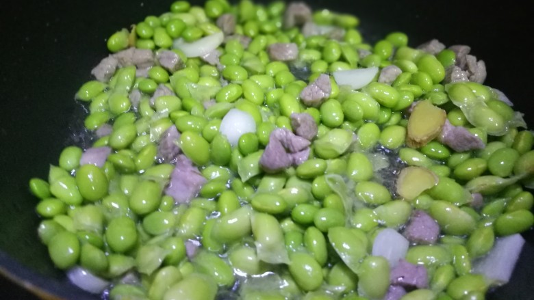 - 把肉切成小丁,毛豆提前放入煎炒可以减短烹饪的时间,让你尽快的离开高温的厨房,放入酱料可以有红烧菜的厚腻油润的口感