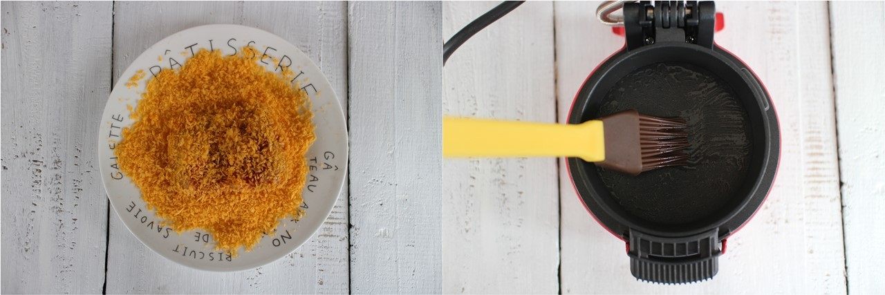 14. 接着在将裹满蛋液的肉放到面包糠里裹一圈,将汉美驰汉堡机插上电,然后在底部的烹饪板上刷一点油