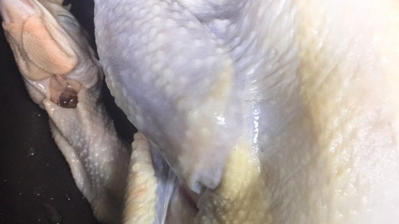 4. 把鸡里里外外都抹上(一层生抽、一层盐焗鸡粉、一层麻油)