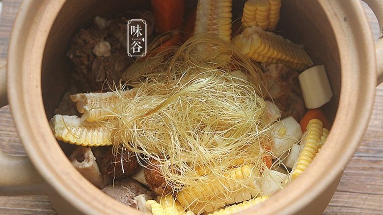 9. 将玉米须等所有材料连同2块姜片一起放入汤煲内;