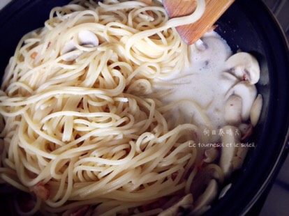4. 加入适量淡奶油及适量清水煮沸(大概1:1),下意面稍微翻煮收汁。