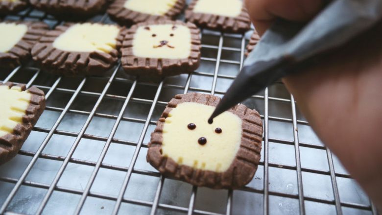 14. 将巧克力液装进裱花袋,为狮子画上五官晾干即可
