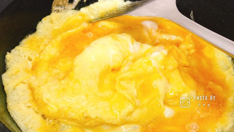 13. 翻炒同时将鸡蛋用锅铲分成块状,倒入芝麻油。