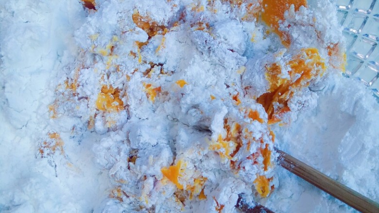 4. 准备一个大盆或大碗,加入南瓜100克,白糖20克,糯米粉300克(不同牌子的糯米粉吸水量即不同,酌情增减)