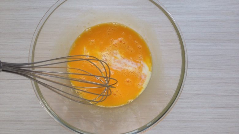 3. 预热烤箱150度。3个蛋黄和1个全蛋打在盆里。
