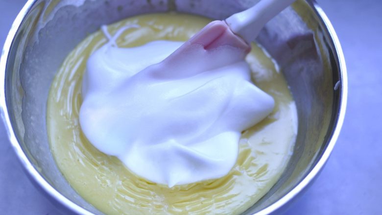 8. 打发好的蛋白分3次与蛋黄糊混合。