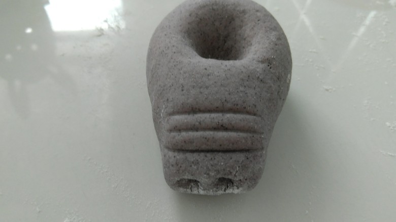 14. 如图,在尖的那头,用筷子戳出,天蓬元帅的性感鼻孔。并用刀背,压出鼻子褶皱。