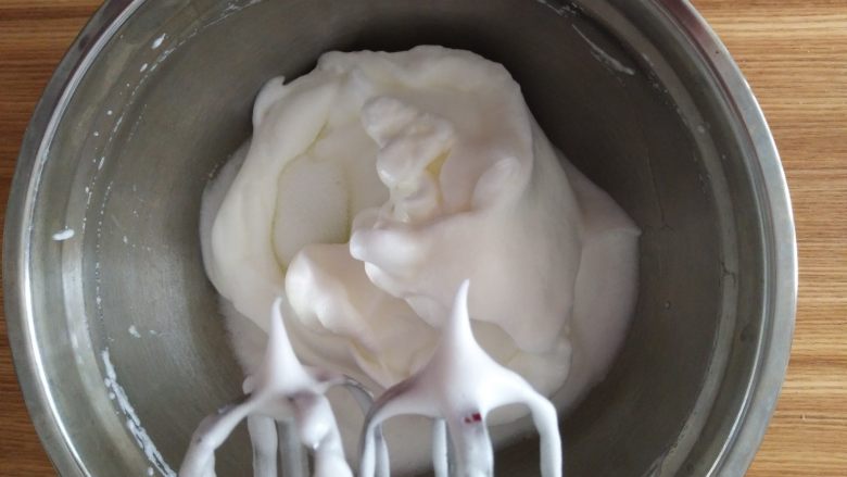 13. 13. 用硅胶刀把盆子上的蛋白挂下来,加入剩余的砂糖,用慢速打