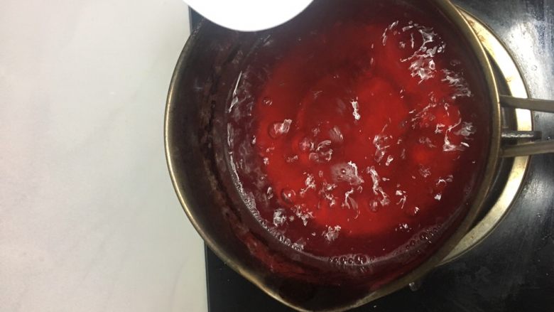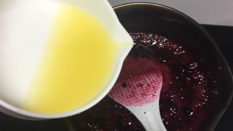 19. 熬完酱的锅,锅边会有剩余的蓝莓酱,建议添一些水,可以煮一些蓝莓汁,我把剩余的柠檬汁加进去了,有些酸了