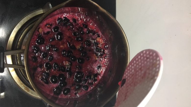 11. 煮的时候会发现还会有颗粒的蓝莓,可以用铲子把蓝莓夹在和锅边之间,用力压,切记一个手把着锅,注意安全,不建议这样,所以尽量在之前就把蓝莓捣的碎些