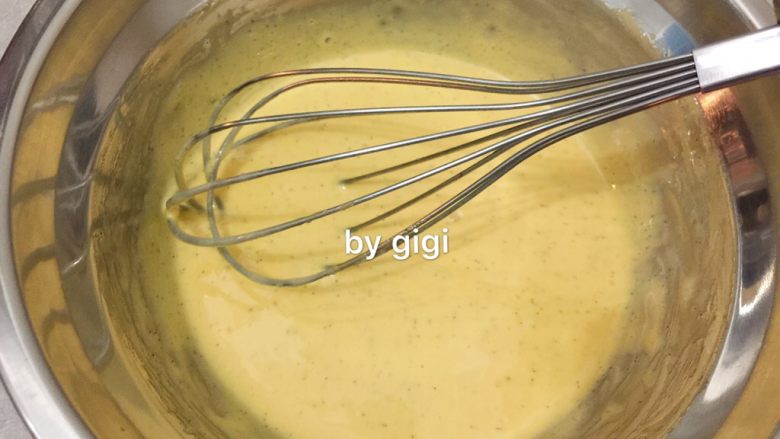 5. 將牛奶裡的豆莢枝取走 牛奶慢慢倒入蛋黃中攪拌均勻(要一邊倒牛奶一邊用蛋抽攪拌混合)