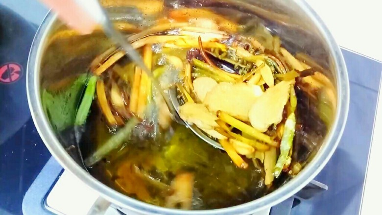 8. 炸至香料变成焦黄色,用过滤勺捞出,弃用。香料捞干净,关火。