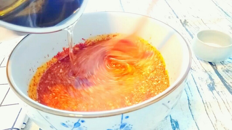 10. 端起小奶锅,将油慢慢倒进辣椒面,同时另一只手拿勺子搅拌辣椒面。直至油全部倒进去。