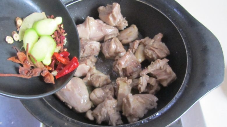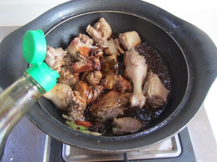 8. 加入适量的水, 煮开后转为小火加盖炖煮15分钟;