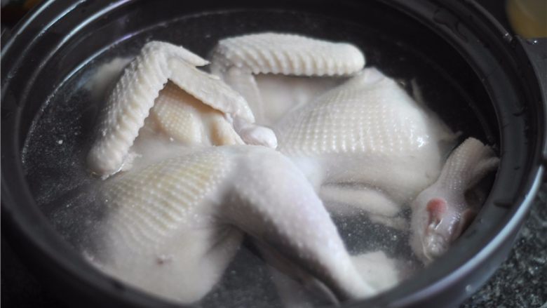 6. 烧开后,撇去浮默默,将鸡捞出来