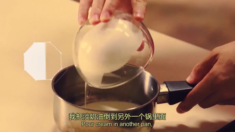 15. 淡奶油放另一个锅里,小火煮热