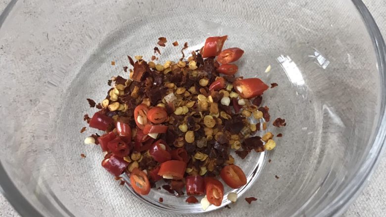 6. 准备一个小碗,装上干辣椒碎和小米椒备用