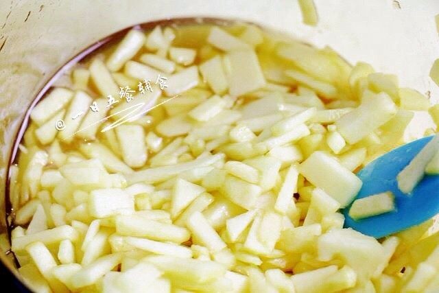 9. 苹果出水后,放入锅中中火煮。 🌻小贴士:熬果酱要用不锈钢锅或不粘锅,不能用铁锅。