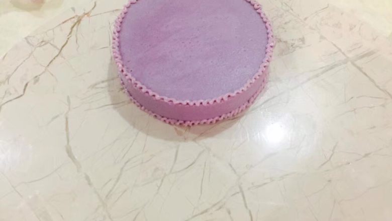 13. 倒入紫薯慕斯液,晃平表面放入冰箱冷藏5个小时以上。