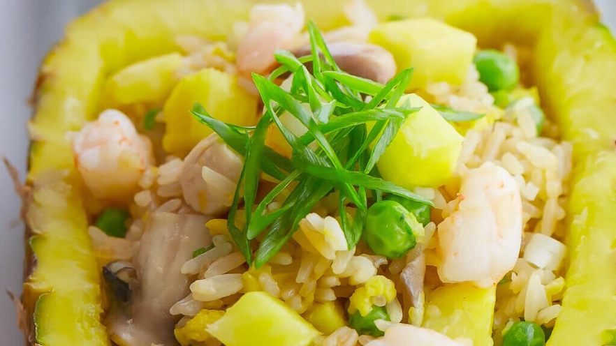 -教你如何轻松地切割一个菠萝,用作一个漂亮的碗。 -常常有一个误解,餐厅质量的炒饭需要在超高的热量烹饪。虽然在炉子上有一个强烈的火焰是很好的,但绝对没有必要。我会告诉你一些简单的烹饪技巧,将保证炒饭松软、粒粒分明。