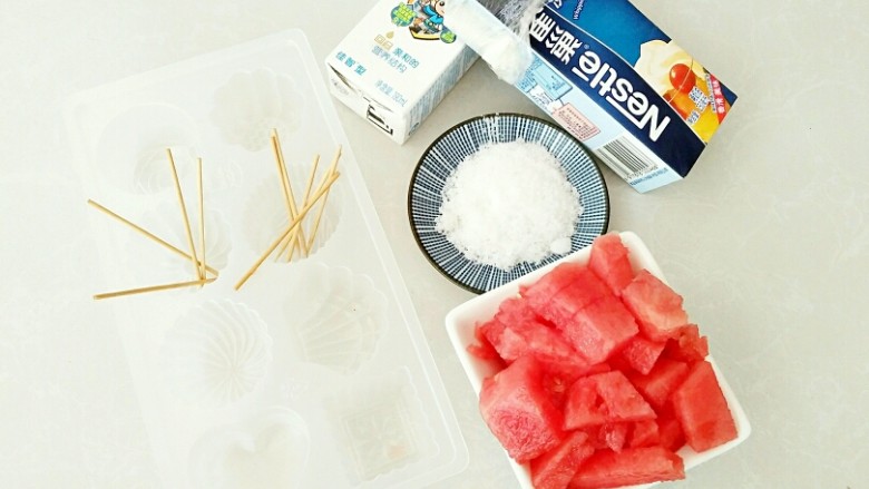 2. 西瓜和砂糖放入料理机中,打成西瓜牛奶汁。