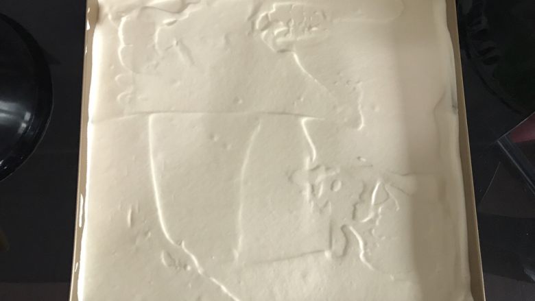 16. 用刮刀将蛋糕糊铺平,四个角也要覆盖好蛋糕糊,不要碰到底部的图案哦。 轻拍烤盘底部,震出大气泡。 放入烤箱,上下火170度烤20分钟,最后5分钟开热风使上色均匀。