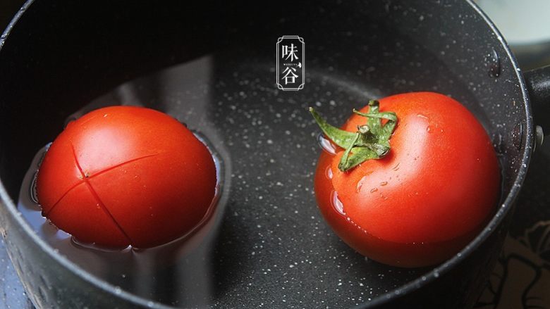 3. 把番茄放入锅内煮至表皮稍微脱落后捞起放凉后剥去表皮;