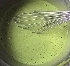 1. 将面皮材料中的面粉、糖、抹茶粉放入蛋盆中用手动打蛋器混合均匀