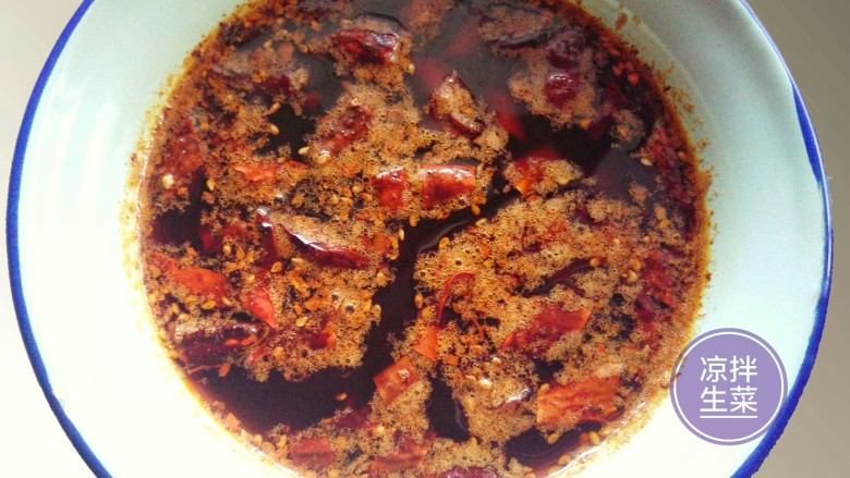 12. 把容器里的备好的食材倒在盘里,盖在新鲜菜叶之上,加入红油辣椒就可以了。