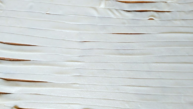 11. 喜欢吃手抓饼的可以在第一次擀开以后,用刀切成一厘米左右的条,注意两头尽量不要切断