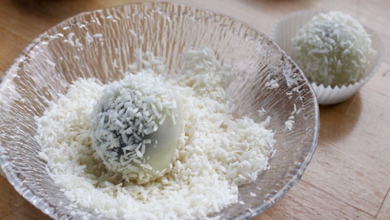 12. 12.裹上椰蓉丝,放在小纸盒中。像这样依次做好其它的。