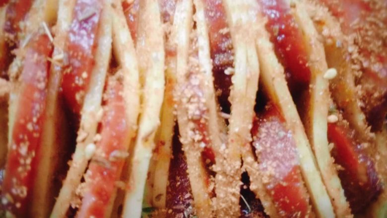 7. 然后撒上一层烧烤料,基本都有卖的。可以再撒上芝麻和孜然粒。