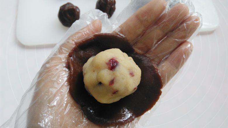 9. 戴上一次性手套,取其中一个面团用2个掌心的摩擦力按扁,放上莲蓉馅