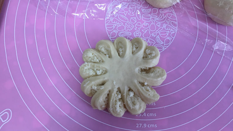 15. 醒面完成后取一块面团擀圆,包入椰蓉馅。