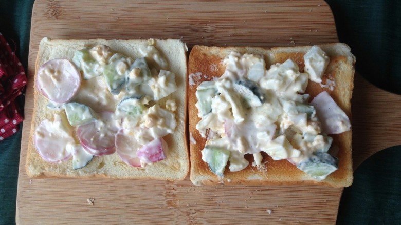 蛋沙拉是由鸡蛋、黄瓜、樱桃萝卜、沙拉酱等制作而成的,在面包片上涂抹上自制的蛋沙拉,即有营养又能填饱肚子,满满的能量早餐。利用多士炉的蒸蛋功能,几分钟时间就可以将整个鸡蛋蒸熟,很方便快捷。这是两人份量的早餐,孩子喜欢金黄色有点焦脆的吐司片,我就喜欢淡淡的颜色,5个档位随心所欲,选择你所喜欢的烤色。