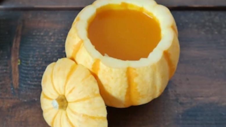 7. 然后用汤勺放入做好的小南瓜盅内