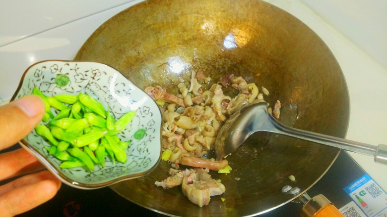 8. 热锅起油,爆香羊脸,放入韭苔花翻炒爆香。