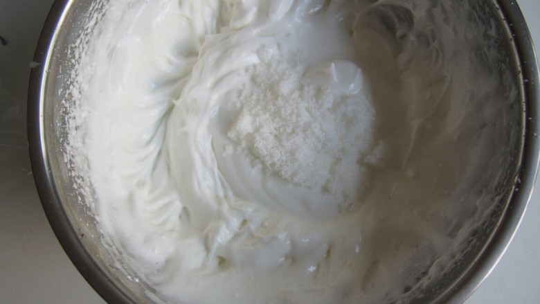 6. 打发至出现纹路加第二次糖,打发至纹路明显加第三次糖,至湿性发泡