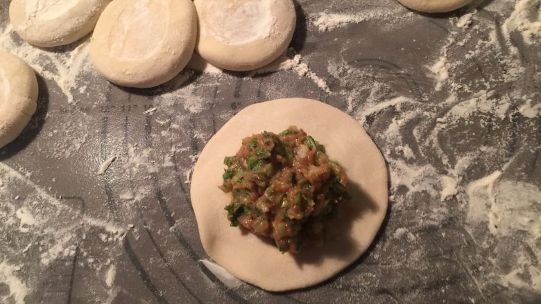 15. 取一个擀成中间厚四周薄的圆片,中间放入适量的菜肉馅